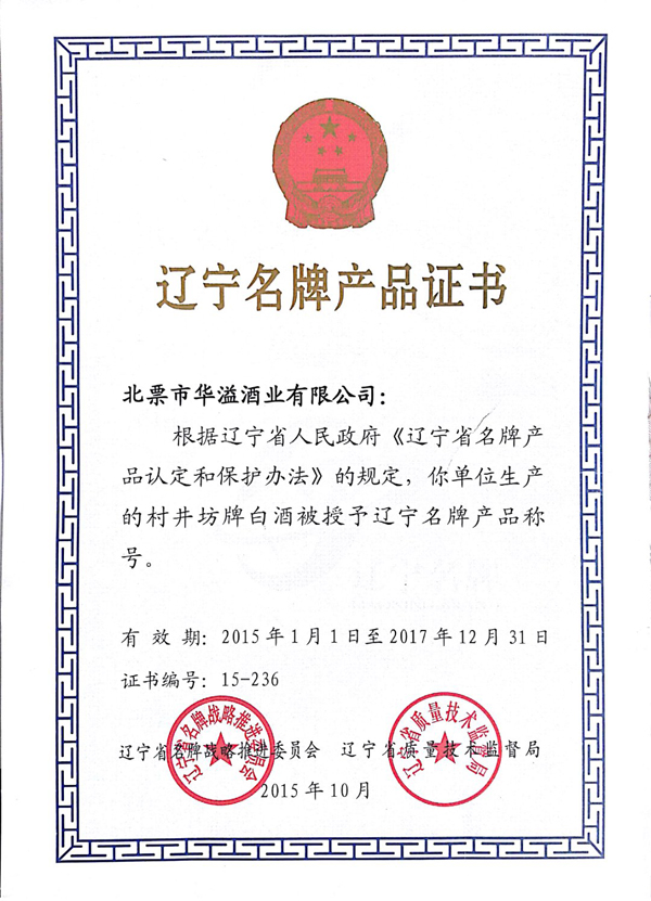 遼寧省名牌產品證書